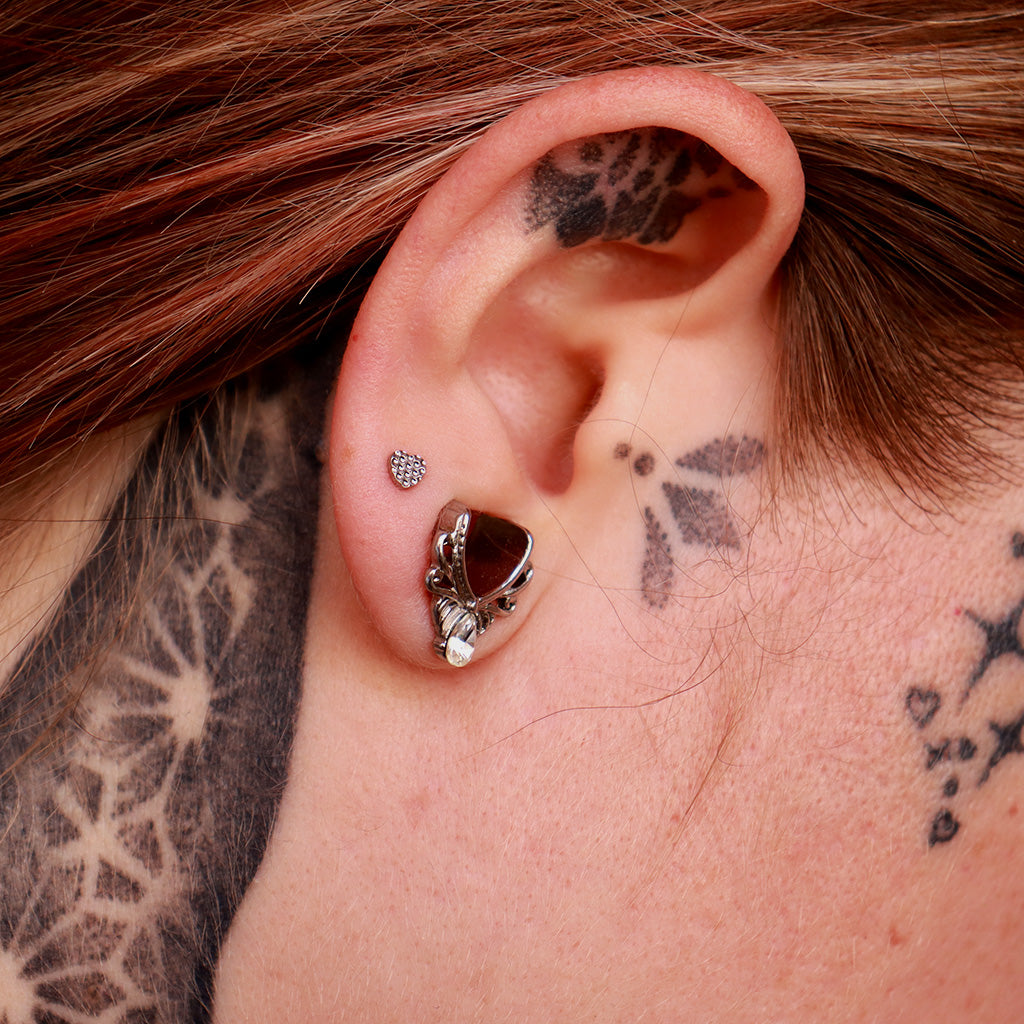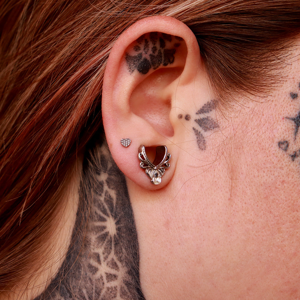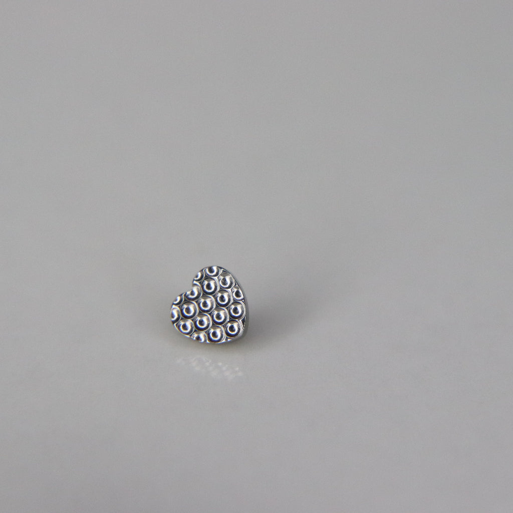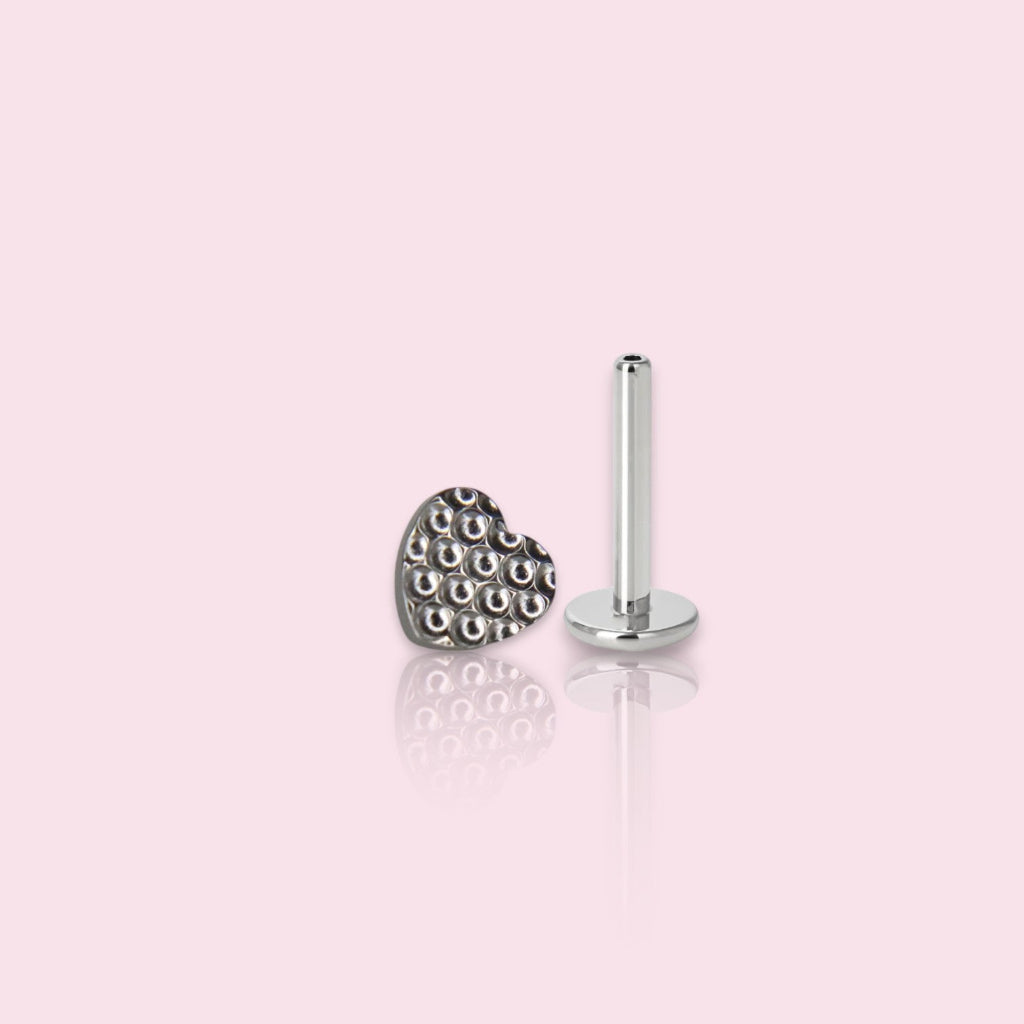 Un detalle delicado con un giro moderno. Este labret tiene forma de corazón con corte circular, un diseño que combina dulzura y minimalismo con un toque arquitectónico.