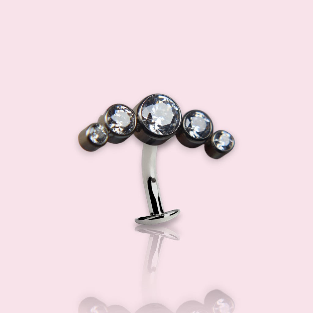 El navel flotante NYRA combina ligereza y sofisticación en una pieza diseñada para destacar. Su top con cinco cristales Swarovski® crea un efecto de brillo suspendido, aportando movimiento y luz con cada gesto.